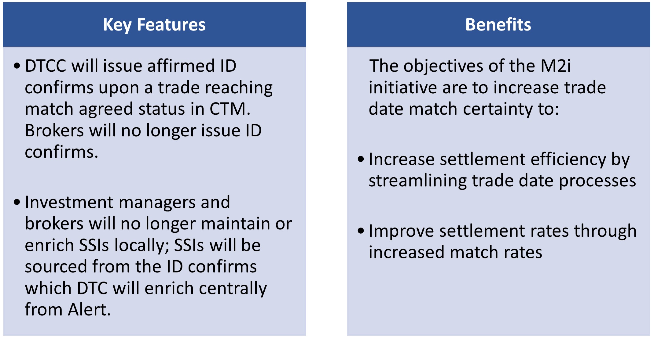 DTCC has launched the Match to Instruct (M2i) initiative designed to improve the trade match and settlement processes within their CTM system. In this new process, DTCC will facilitate a “single match” on trade date which will become the “golden source” trade record that flows through to the settlement agents.